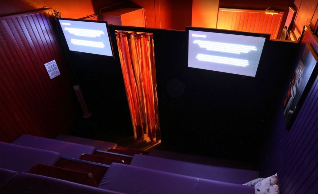 On arrive ensuite dans la pièce principale, l’espace « lounge » avec quelques divans et le bar. C’est une pièce accueillante, comme partout ailleurs dans le club, l’éclairage est tamisé. C’est un endroit propice à la discussion lors d’une première approche par exemple. A droite du bar, un double rideau qui mène à un nouveau couloir. Si on prend par la gauche, on arrive à un salle de cinéma pourvue de 3 gradins (environ 24 places assises). Deux grands écrans plats diffusent des films hétéros.